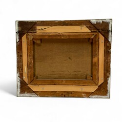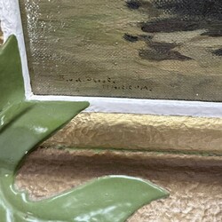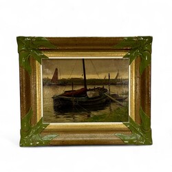 | Omschrijving | Schilderij, olieverf op doek. Vissersschepen in de haven van Makkum. Linksonder gesigneerd Bouke van der Sloot (Franeker 1908 – Leeuwarden 1995), verso datering 1956. In goudkleurige profiellijst met groenbeschilderde bladvormige motieven in de hoeken. |
