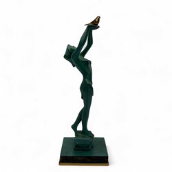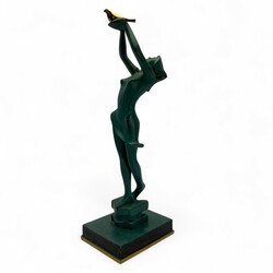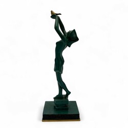 | Omschrijving | Groen gepatineerd bronzen beeld met vergulde details: gestileerde jonge vrouw die een vogel vrijlaat, staand op vierkant basement, onduidelijk gesigneerd in basement, modern |