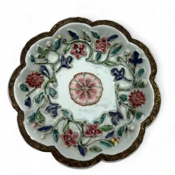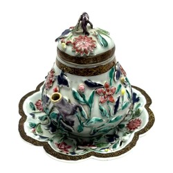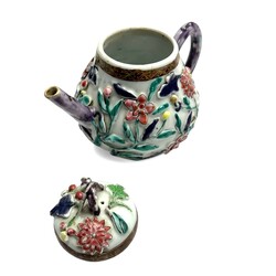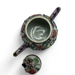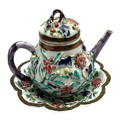 | Omschrijving | Chinees porseleinen famille rose theepotje met bijbehorende geschulpte onderschotel, het geheel rijkelijk gedecoreerd met verhoogde florale motieven in paars, groen en roze, afgezet met bruin-goudkleurige servetranden, Yongzheng |
