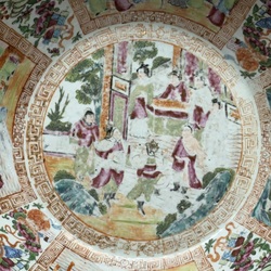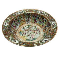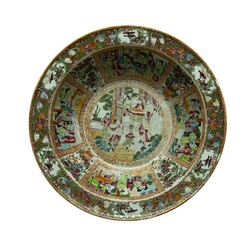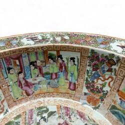 | Omschrijving | Grote Chinees porseleinen Cantonese famille rose kom, de rand met vogels in cartouches, waaromheen bloemen en vleermuizen, het interieur met cartouches met figuren en kostbaarheden, de ziel met dansend gezelschap, 18e/19e eeuw |
