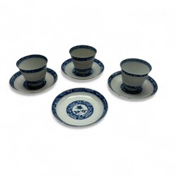 | Omschrijving | Drie Chinees porseleinen kop-en-schotels, en één losse schotel, alle met blauw-wit floraal decor in dubbele bies, Qianlong |