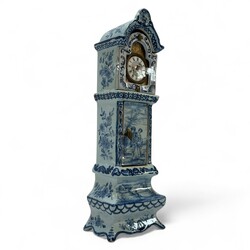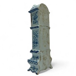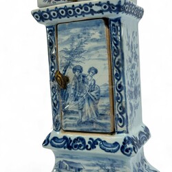 | Omschrijving | Delfts blauw aardewerk miniatuur staand horloge, met verguld metalen klokje binnenin, niet gemerkt, 19e eeuws |