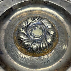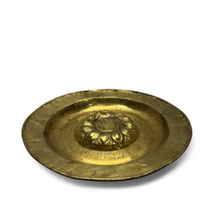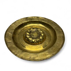 | Omschrijving | Geelkoperen doopschotel, de opgehoogde ziel met bladmotieven waaromheen tekst, in de rand zijn symbolen geslagen van bladeren en klokken, Duitsland, Neurenberg, 16e eeuw |
