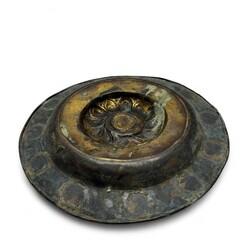 | Conditie | Gebruikssporen, waaronder deuken in de rand. De ronde ornamenten -die oorspronkelijk op de rand zaten bevestigd, tussen de symbolen- zijn verwijderd. |