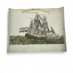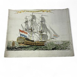 | Omschrijving | Drie 18e-eeuwse kindertekeningen van Hollandse schepen, waaronder: Grote galjoen met op de boeg het stadswapen van Amsterdam en in de banner in de lucht het opschrift ‘Amsterdam anno 1773’, onduidelijk gesigneerd, andere twee tekeningen zonder tekst in de banners, alle drie Oost-Indische inkt ingekleurd met aquarel |