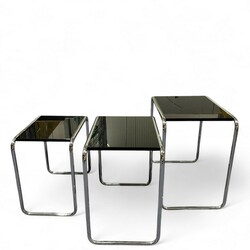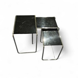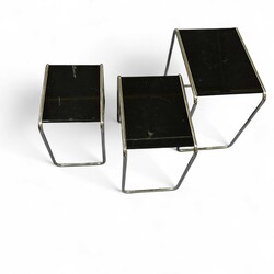 | Omschrijving | Lot van drie 20e eeuwse bijzettafels, chroom met zwart blad. Gispen, uitvoering gebroeders Van der Stroom. |