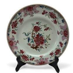 | Omschrijving | Drie Chinees porseleinen famille rose borden met florale motieven: tweemaal met centraal pioenrozendecor, waarvan een met rijkelijk gedecoreerde rand met kostbaarhedendecor, en éénmaal met centraal chrysantendecor, 18e eeuw |