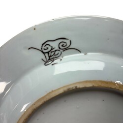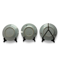 | Conditie | Bord met chrysantendecor: chip met haarlijn; bord met kostbaarhedendecor in de rand: diverse haarlijnen in de ziel, zichtbaar aan de achterzijde; andere bord met pioenrozendecor: randchips |