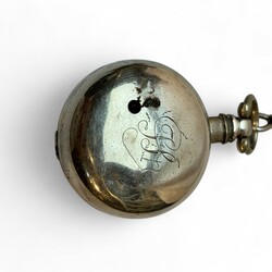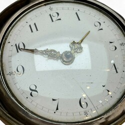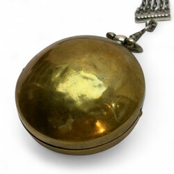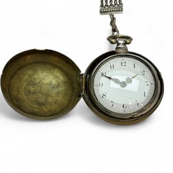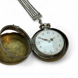 | Omschrijving | 18e eeuwse zilveren herenhorloge in dubbele zilveren kast en in koperen beschermkast en met zilveren chatelainme voorzien van 3 signetten |