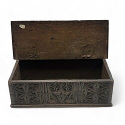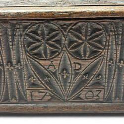 | Omschrijving | Fries kerfsnede documentenbak, gedecoreerd met bloemen en rozetten, aan de voorzijde met datering ‘A.D. 1703’ |