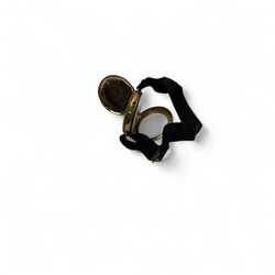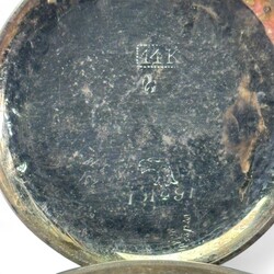 | Omschrijving | Rond 14 karaats gouden dameshorloge met geëmailleerde wijzerplaat, interieur met inscriptie: 'Remontoir Cylindre 6 Rubis', aan zwart stoffen bandje |