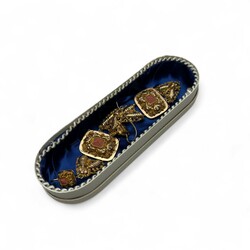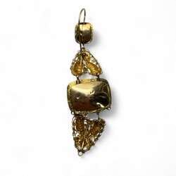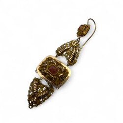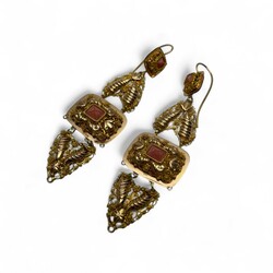 | Omschrijving | Paar rijkelijk gedecoreerde 14 karaats gouden oorhangers met filigrain, ingelegd met bloedkoraal |