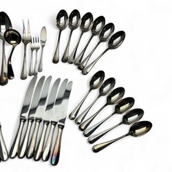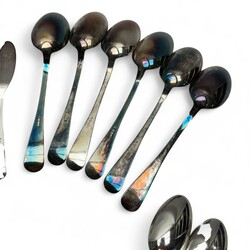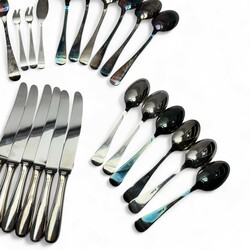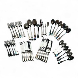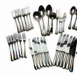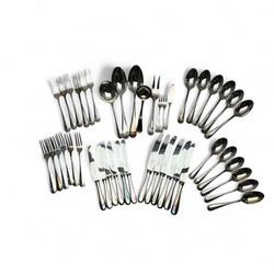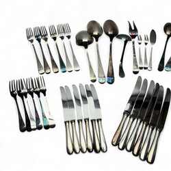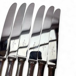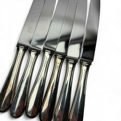 | Omschrijving | Een zesdelig tweede gehalte (835/1000) zilveren bestek, model Haags Lof. Bestaande uit zes grote messen (23,5 cm), zes kleine messen (20,5 cm), zes grote lepels (20 cm), zes kleine lepels (17,5 cm), zes grote vorken (20 cm) en zes kleine vorken (17,5 cm). En daarnaast twee belegvorkjes (13,5 cm), botermesje (16,5 cm), juslepel, aardappellepel, vleesvork en twee groentelepels. Allen gemerkt VKB = Van Kempen & Begeer, jaarletters L (1971) en M (1972). |