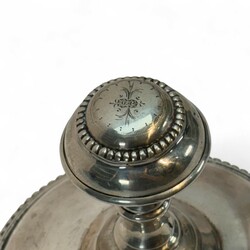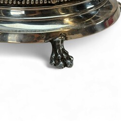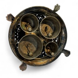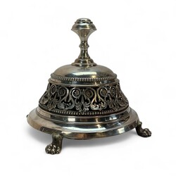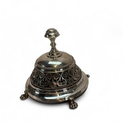 | Omschrijving | Grote tweede gehalte zilveren altaarbel met vier bellen, parelranden en opengewerkte rand met florale motieven, staand op klauwpootjes |