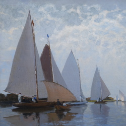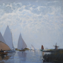 | Omschrijving | Schilderij, olieverf, marouflé. "Zeilwedstrijd Houkesloot", rechtsonder gesigneerd Ids Wiersma (Brantgum 1878 – Dokkum 1965), gedateerd 1916.