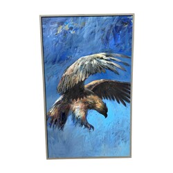 | Omschrijving | Schilderij, olieverf op doek. Voorstelling van een roofvogel, titel ‘Felsö’. Linksonder gesigneerd János Bittenbinder (Roemenië, 1946). |