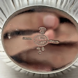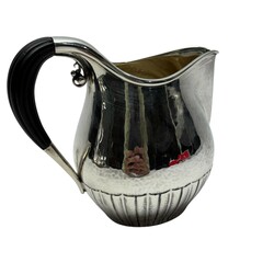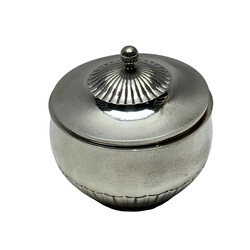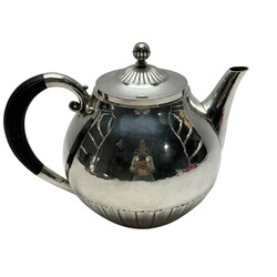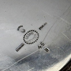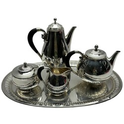 | Omschrijving | Een 20e -eeuws vijfdelig eerste gehalte (925/1000) zilveren koffie- en theeservies, bestaande uit een ovaal dienblad, koffiepot, theepot, suikerpot en melkkan. Ontwerp Johan Rohde (1956-1935) voor Georg Jensen, allen gemerkt met monogram JR, ‘Georg Jensen’ en ‘Sterling’. Betreft model ‘Cosmos’ (melkkan en suikerpot 45C, dienblad 45B, theepot en koffiepot 45A). |