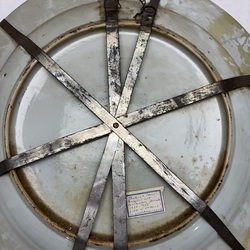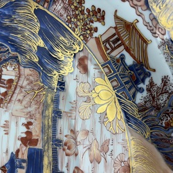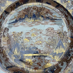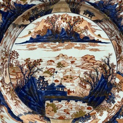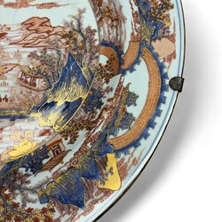 | Omschrijving | Een kapitale 18e eeuwse Chinees porseleinen schotel, met onderglazuur blauw en bovenglazuur rood-goud imari decor, voorstelling van een landschap met pagode’s, bergen en de Chinese muur. Ca. 1730. |