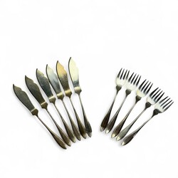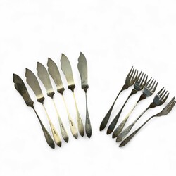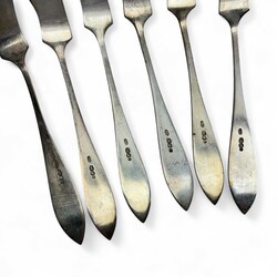 | Omschrijving | Lot tweede gehalte (835/1000) Nederlands visbestek, bestaande uit vijf vorken en zes scheppen. Allen gemerkt Mr. GB (zilverfabriek Baardwijk, Nieuwpoort, tussen 1949 en 1957), jaarletter O (1949). |