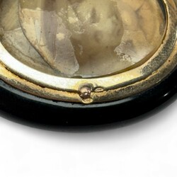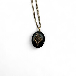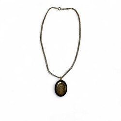 | Omschrijving | Ovaal onyx rouwmedaillon met 14 karaats gouden portretlijstje, aan de achterzijde met bloemvormige applique ingelegd met zaadpareltjes, 19e eeuw, aan gouden ketting -niet gemerkt- met onedel sluitinkje |