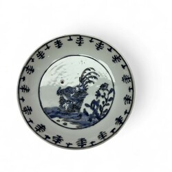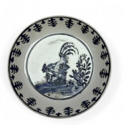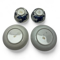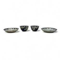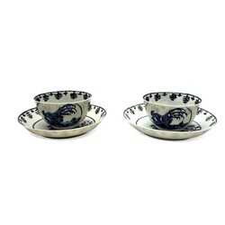 | Omschrijving | Paar Chinees porseleinen kop-en-schotels, met in opgehoogd blauw glazuur gedecoreerd met parende haan en kip, de rand met palmetmotief, 18e eeuw |