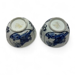 | Kavel | 21. Paar Chinees porseleinen kop en schotels met blauw emaille decor van haantjes |