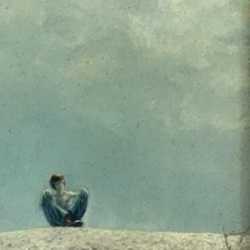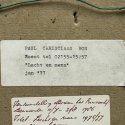 | Omschrijving | Schilderij, olieverf op paneel. Voorstelling van een man zittend op een heuvel, verso titel 'Lucht en mens'. Linksonder gemonogrammeerd 'PCB' = Paul Christiaan Bos (Haarlem, 1956), gedateerd 1977. Tentoongesteld in Princessehof Leeuwarden, 1986, ex-collectie W.F. Veldhuysen. |