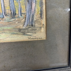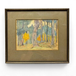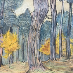 | Omschrijving | Theo van Hoytema (1863-1917), boslandschap in geel, paars en blauw, potloodtekening, rechtsonder gesigneerd |