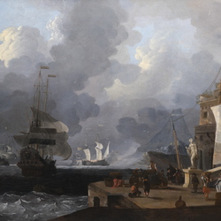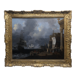 | Omschrijving | Schilderij, olieverf op doek. ‘Italianiserend zeegezicht met haven’ (‘A mediterranean harbour scene’). Draagt monogram 'LB', toegeschreven aan Wigerus Vitringa (Leeuwarden 1657 – Wirdum 1725). In vergulde ornamentenlijst. Herkomst: Christie’s London, Old Masters Pictures, 6 december 2006 (als ‘Circle of Ludolf Backhuysen). Tevens provenance uit 1980 en 1993. Literatuur: Wigerus Vitrina, De Zeeschilder van Friesland (Elzinga, 2008), blz. 56-59. Tevens in Friese Schilderkunst In De Gouden Eeuw, P. Bakker p. 38 |