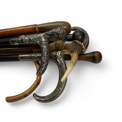| Omschrijving | Lot van twaalf diverse wandelstokken, waaronder antiek en met een derde gehalte (800/1000) zilveren greep. |