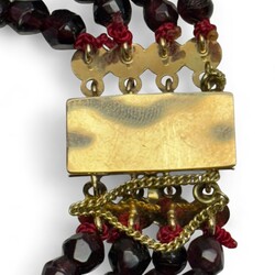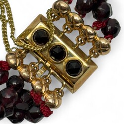 | Omschrijving | Vierstrengs granaten armband met 14 karaats gouden sluiting, de sluiting ingelegd met drie ronde granaatjes, 19e eeuw |