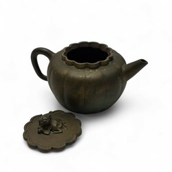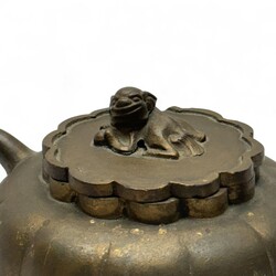 | Omschrijving | Een antiek 18e of 19e eeuws Chinees porseleinen trekpot, Yixing, met bronsglazuur. Bloemvormige deksel, bekroond met een tempelleeuwtje. |