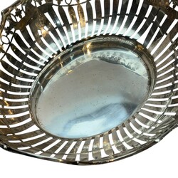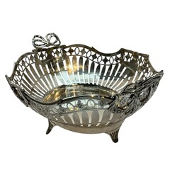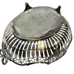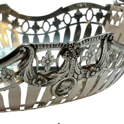 | Omschrijving | Een 20e eeuwse tweede gehalte (835/1000) zilveren broodmand, fraai versierd met zaag-en graveerwerk alsmede guirlandes met medaillons en grepen in de vorm van strikjes, geplaatst op 4=vier pootjes. Mr. W.A. van Achteren, Den Haag, 1916. |