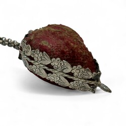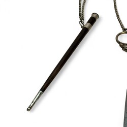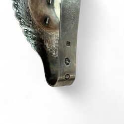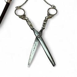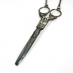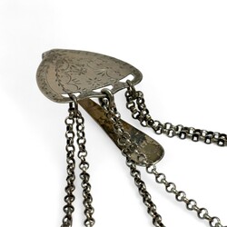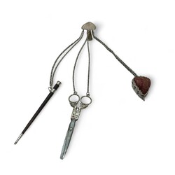 | Omschrijving | Zilveren chatelaine bestaande uit zilveren rokhaak, zilveren ketting met daaraan zilveren schaar,breischede en speldenkussen |