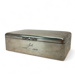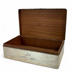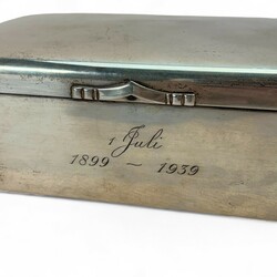 | Omschrijving | tweede gehalte zilveren kist met aan de voorzijde gravering: ‘1 juli 1899-1939’, interieur van hout, meesterteken A. Presburg, Haarlem, 1938 |