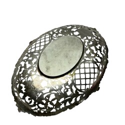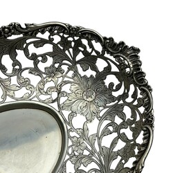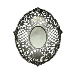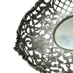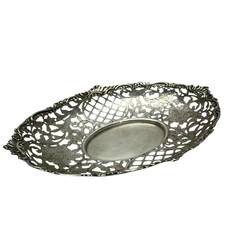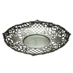 | Omschrijving | Een 20e eeuwse tweede gehalte (835/1000) zilveren mand, ajour gezaagd en gegraveerd met bloemmotieven, de rand met rocailles. Mr. van Eldik (Hollandia Zilversmederij). |