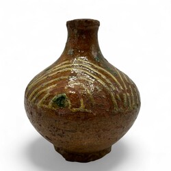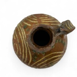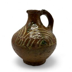 | Omschrijving | Een antiek 17e eeuws bruin aardewerken oliekannetje met slibdecor. |