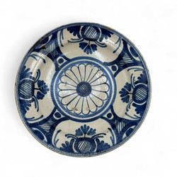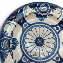 | Omschrijving | Een antieke aardewerken schotel, met blauw-wit decor. Vermoedelijk Nederlands, 17e eeuws. Conditie: gekramd. |