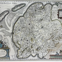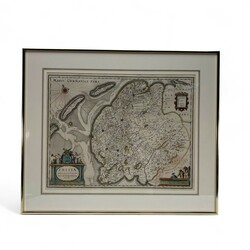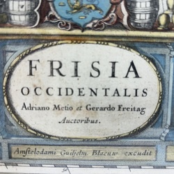 | Omschrijving | Een antieke 17e eeuwse handingekleurde kopergravure, kaart van Friesland (Frisia Occidentalis Adriano Metio et Gerardo Freitag), uitgegeven in 1634, uit 'Gerardi Mercatoris et I. Hondii Atlas ofte Afbeeldinghe vande gantsche Weerldt'. |
