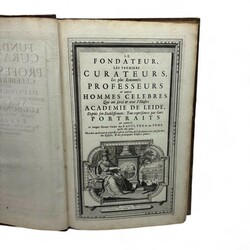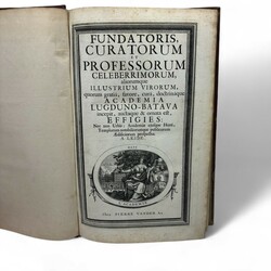 | Omschrijving | Een 18e eeuws boek 'Fundatoris, Curatorum et Professorum celeberrimorum aliorumque illustrium virorum' uitgegeven te Leiden tussen 1715 en 1716 door Pieter van der Aa (1659-1733). Met o.a. kaart van de Hortus Botanicus ('plan du jardin l'academie de leiden'), S. Pancras Kerck en de Nieu Gefondeerde Kerck in Leiden, en 130 kopergravures van Leidse professoren. |