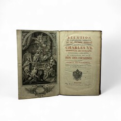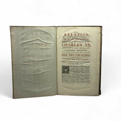 | Omschrijving | Een 18e eeuws Frans boek 'Relation de l'Inauguration Solemnelle De Sa Sacrée Majesté Imperiale Et Catholique Charles VI. Empereur Des Romains Toujours Auguste, et Troisième du nom Roy Des Espagnes Comme comte de Flandres Celebrée a Gand Vill Capitale de la Province le XVIII.' Door Augustin Graet, 1719. In lederen band met vergulde wapens en zes kopergravures, waaronder groot formaat (85 x 95 cm). |