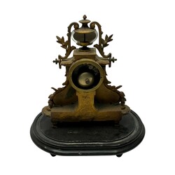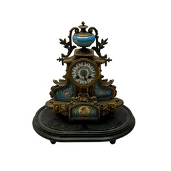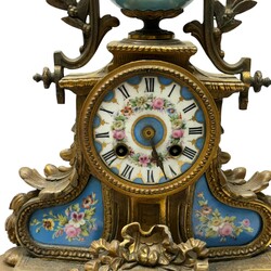 | Omschrijving | Een antieke 19e eeuwse Franse pendule, verguld, met handbeschilderde porseleinen plaquettes, o.a. met decor van bloemen en centraal onder een portretmedaillon. Op zwart plateau |