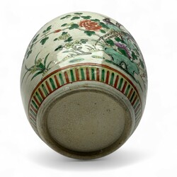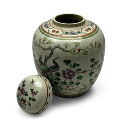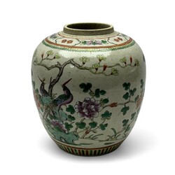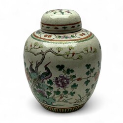 | Omschrijving | Een antieke 19e eeuwse Chinees porseleinen gemberpot met decor van twee vogels. Conditie: in goede staat. |
