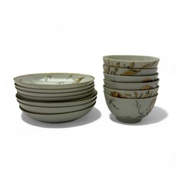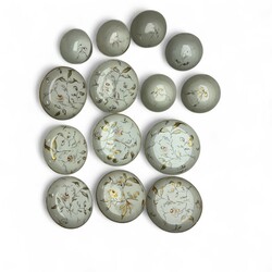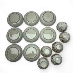 | Afmetingen | Schotels 13 cm doorsnede, koppen 4,5 cm hoog x 8 cm doorsnede. |