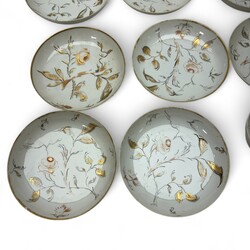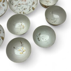 | Omschrijving | Acht Qianlong Encre de Chine Chinees porseleinen schotels met zes bijpassende koppen. Met een floraal decor met vergulde accenten. |