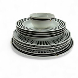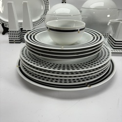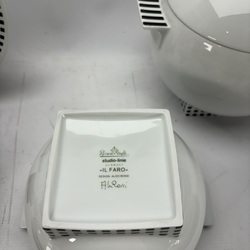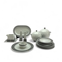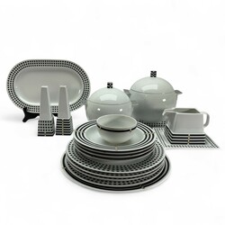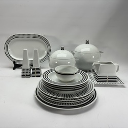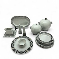 | Omschrijving | Lot diverse serviesdelen, gestreept en blokjespatroon. Ontwerp Aldo Rossi voor Rosenthal Studio-Linie. |