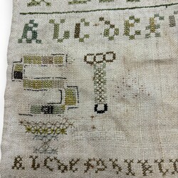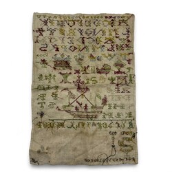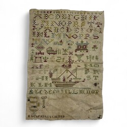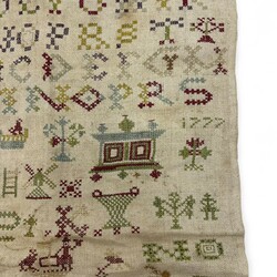 | Omschrijving | Een antieke 18e eeuwse Friese merklap, gedecoreerde met diverse voorwerpen, o.a. een wieg, boom, schip en kussenkast. Gedateerd 1777. |