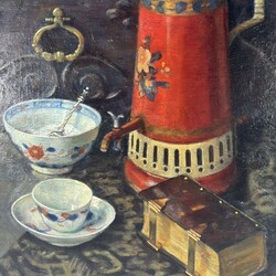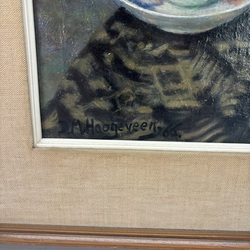 | Omschrijving | Schilderij, olieverf op doek. Stilleven met kraankam, imari kop en schotel en kom en Bijbel met gouden sloten. Linksonder gesigneerd Douwe Mattheus Hoogeveen (1891-1976). In Heijdenrijk lijst. |