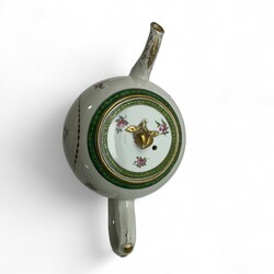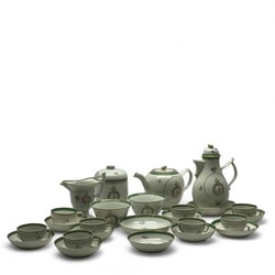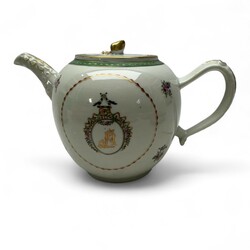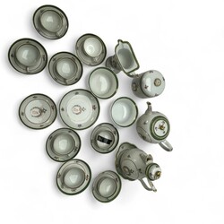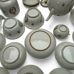 | Omschrijving | Een 22 delig 18e eeuws Chine de Commande porseleinen thee en koffie servies. Bestaande uit thee en koffiepot, helmkan, pattischaaltje, kommen, dekselpot en diverse kop en schotels. Alles met een alliantie wapen met monogram, waarschijnlijk voor een huwelijk besteld. Deksel theepot gelijmd, dekselknop pot kleine beschadiging. Ca 1760. |