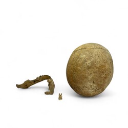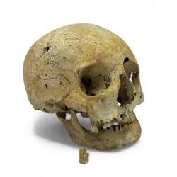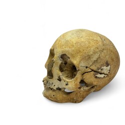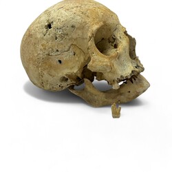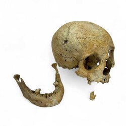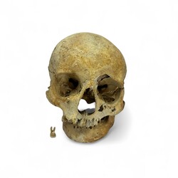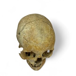 | Omschrijving | Een menselijke schedel, kompleet met onderdaak. Enkele tanden nog aanwezig, maar los. Met een formulier met geschiedenis, waar gevonden etc. |